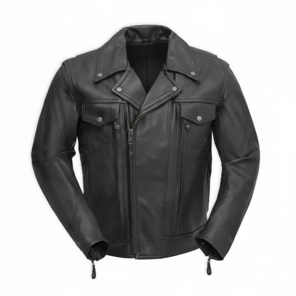 The Black Raven Leather Jacket the look of a more classic motorcycle style jacket with the pockets and features of one of our best sellers, the Raider jacket. With 8 hidden utility pockets, two conceal carry pockets, and armor pockets, you’ve got more pockets than you’ll know what to do with. It also features an action back, underarm gussets and a zip out thermal liner.