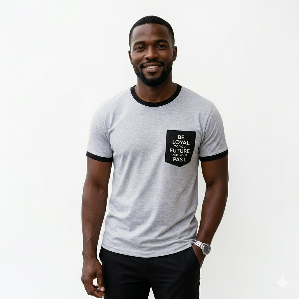 • Statement Pocket Graphic: A functional black chest pocket serves as the canvas for the motivational “BE LOYAL TO YOUR FUTURE, NOT YOUR PAST” typography. The crisp white lettering against the black pocket creates an immediate focal point.
