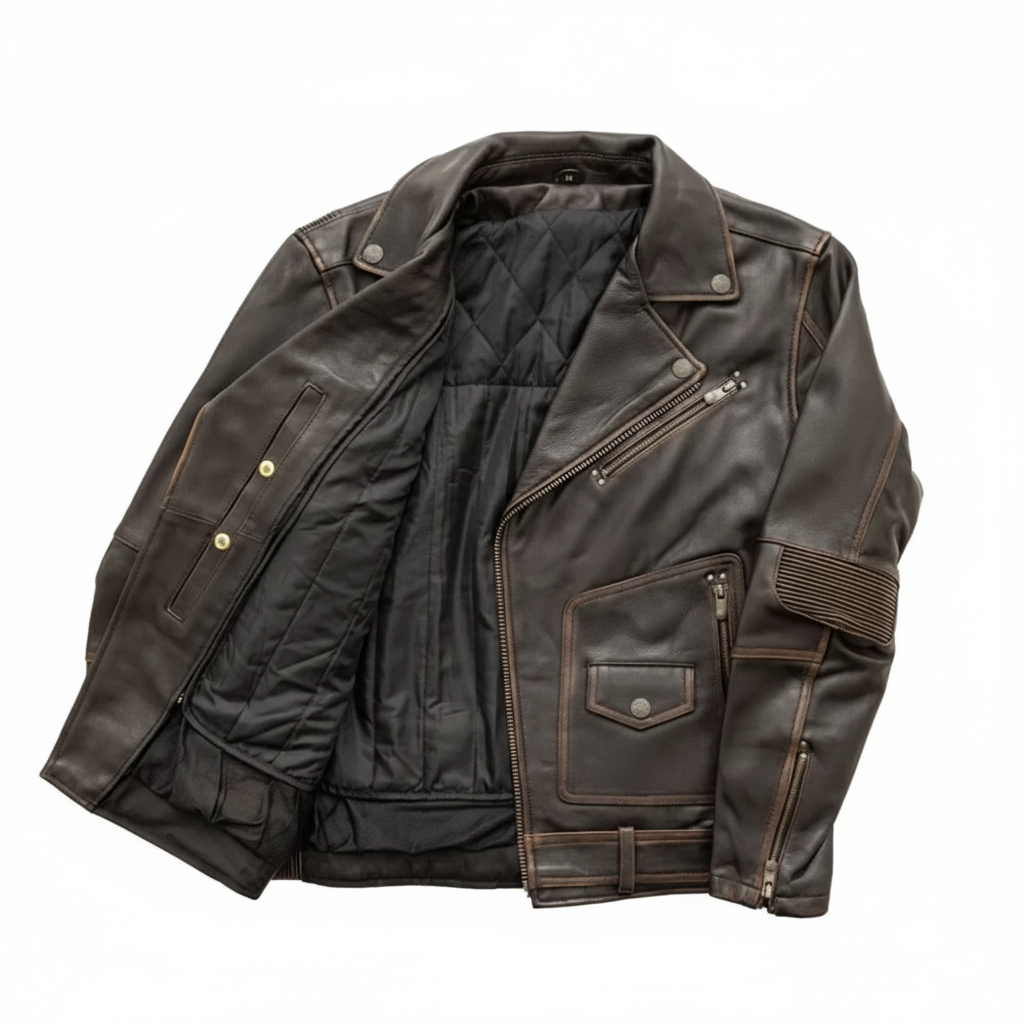 Raw Power. Authentic Craft. The Rogue Earth-Tone Biker is a masterpiece of vintage-inspired engineering. Moving away from traditional black, this jacket features a rich, deep chocolate brown finish with hand-burnished edges for a multi-dimensional look. With its bold cross-zip closure and integrated waist belt, it offers a heavy-duty, protective feel without sacrificing refined style.
