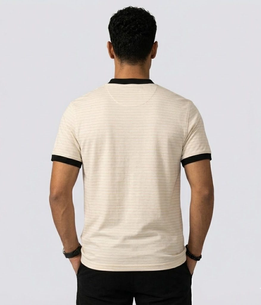 • Contrast Ringer Detailing: The obsidian black ribbing on the collar and sleeve cuffs frames the garment, providing a bold, athletic contrast that anchors the lighter palette of the body.